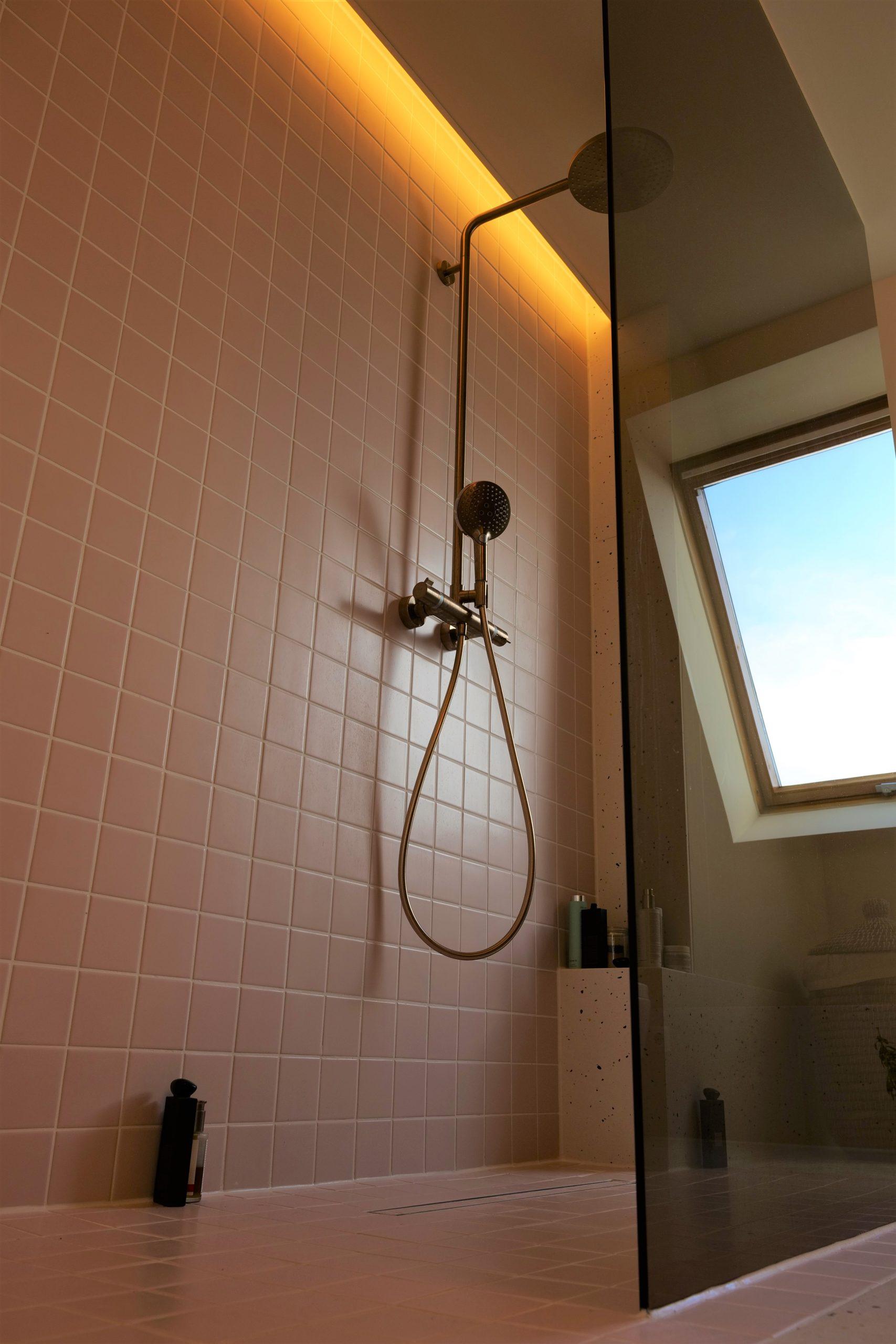 Das Badezimmer wurde sehr offen und hell gestaltet. Dazu wurde eine großzügige Duschlandschaft auf der linken Seite des Badezimmers eingeplant, welche durch indirektes Licht beleuchtet wird! Die Dusche wird durch ein Bronze Farbenes Sicherheitsglas getrennt, welches sowohl im Boden als auch in der Decke zu verschwinden scheint.