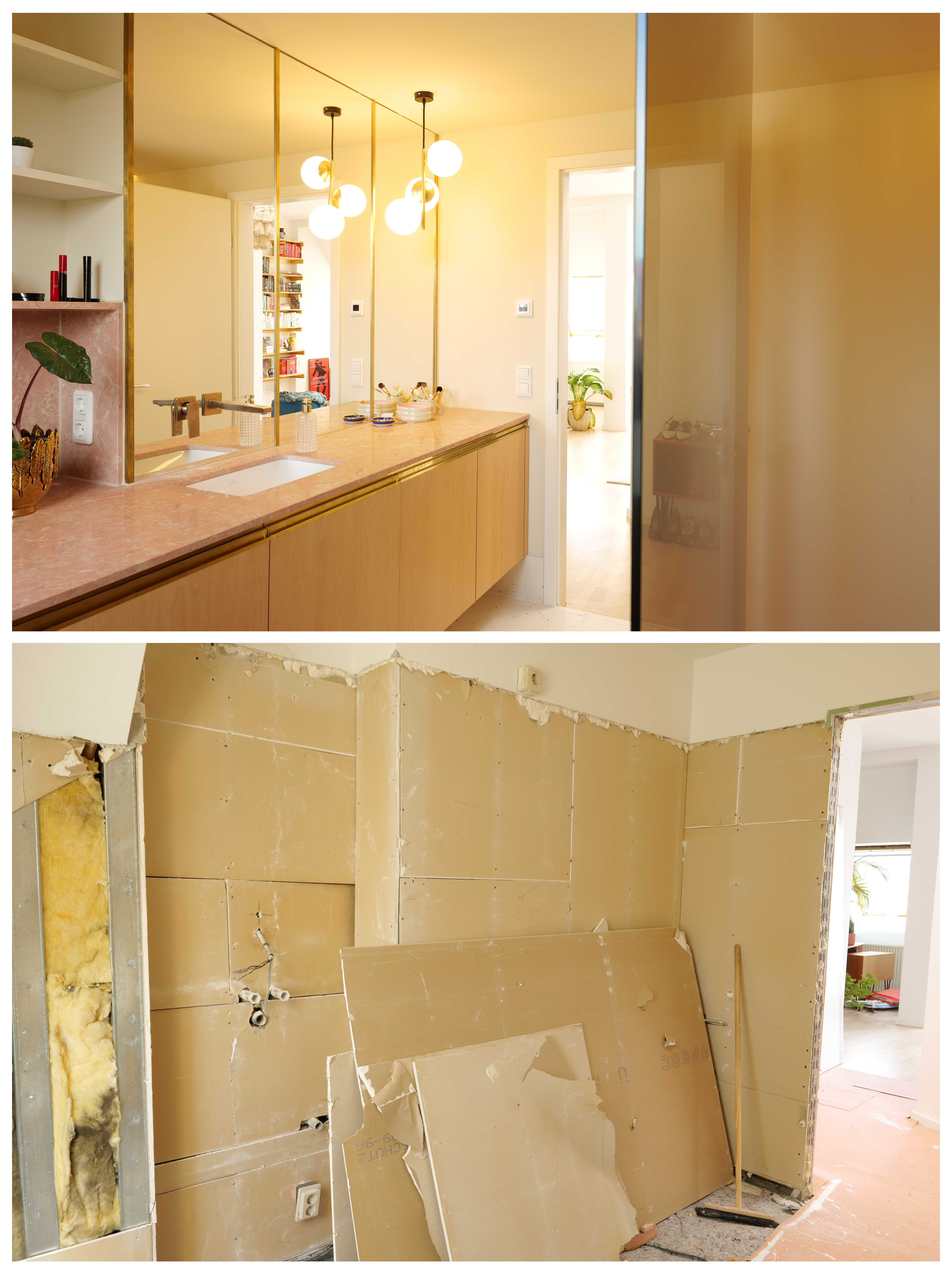 Auf der rechten Seite wurde ein Waschtisch mit Unterbauwaschbecken installiert, welches vom Tischer Betrieb : HU Design umgesetzt worden ist. Der Waschtisch wird durch eine Steinplatte und einen 3 teiligen Spiegel mit Messing Elementen abgeschlossen.
